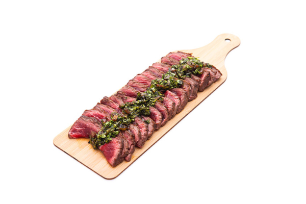 Tranches de filet de boeuf juste snackées, sauce chimichurri légérement herbacée et relevée.